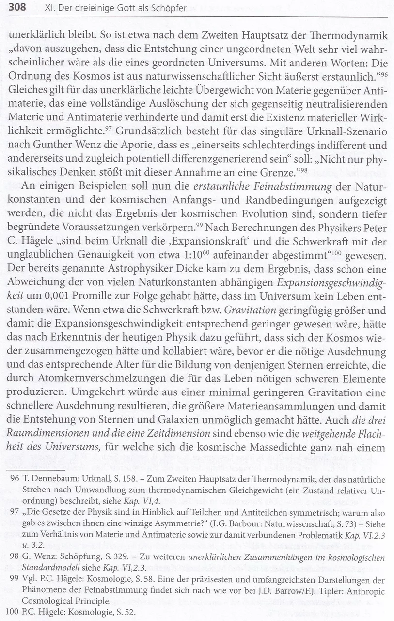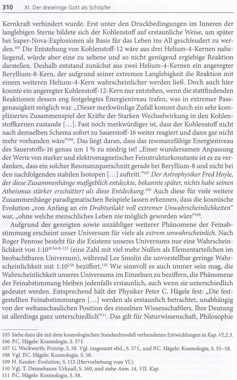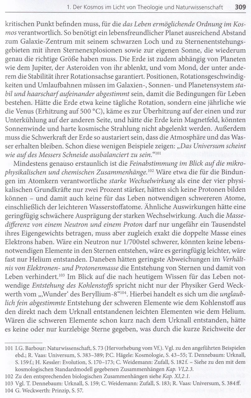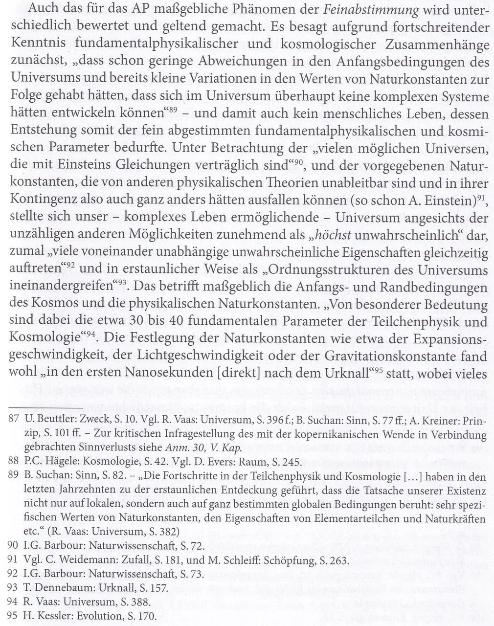 Das Erstaunlichste für Theologen, Philosophen und selbst für Naturwissenschaftler der Richtung Astrophysik und Kosmologie, ist die unglaubliche Feinabstimmung der Konstanten, die das Universum von Beginn an auszeichnen und seine Entwicklung und seine Existenz bestimmen. Binnen Nanosekunden nach dem Urknallereignis müssen sie bereits geherrscht haben. Niemand anders hat diese Zusammenhänge in so treffender und trefflicher Weise zusammengestellt als Haudel (2023). Ich erlaubte mir deshalb, vier Seiten seines Buches einzuscannen und hier zu übernehmen, zudem als Leseprobe, des überaus lesenswerten Buches.