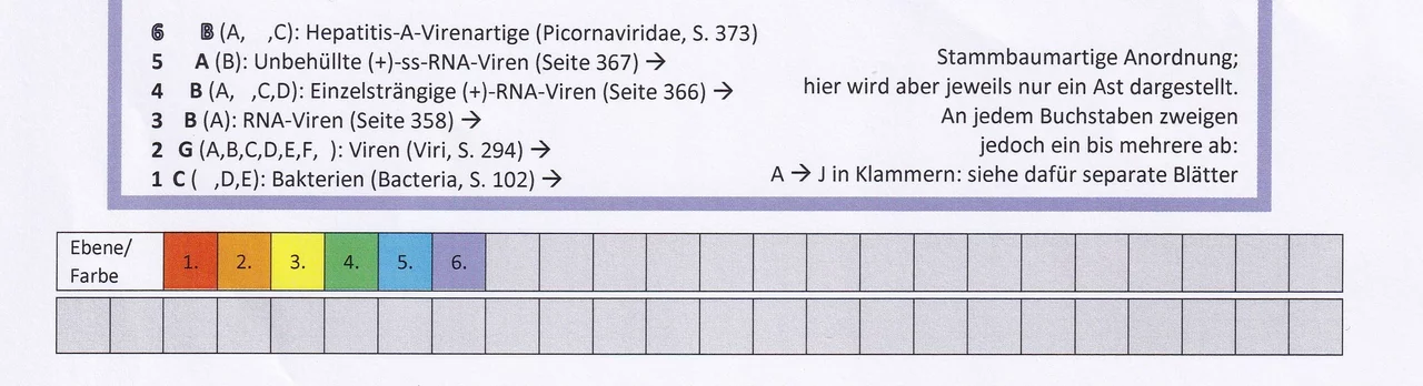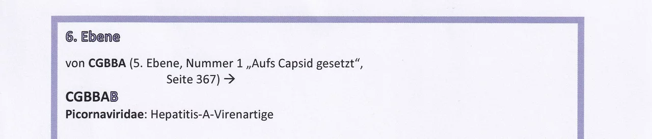 B Hepatitis-A-Virenartige, 6. Ebene (neben A, das schon vorne/oben behandelt wurde und neben C das erst weiter hinten/unten steht): ergibt von unten nach oben gelesen für Hepatitis-A-Virenartige den Code CGBBAB