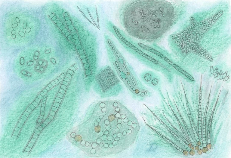 Blaualgen verschiedener Organisationsformen: Coccal als Einzelzellen in Schleim gebettet (links oben); mit dicker Zellwand versehen, die Teilungsstadien noch gut zusammenhält, Gattung Chroococcus (gleich darunter); Fäden, die sich verzweigen, indem sich ein Tochterfaden aus der Hülle des Mutterfadens zwängt und dabei seine eigene bildet, Gattung Scytonema (zwei unterschiedliche Ansichten; rechts sich anschließend); perlschnurartige Fäden in gemeinsamer Schleimhülle mit Heterocysten, Gattung Nostoc (Mitte unten); polar gestaltete Fäden, basal jeweils mit einer Heterocyste, Gattung Rivularia (rechts unten); eine ebene, rechteckige Platte aus Einzelzellen, von gemeinsamer Schleimschicht zusammengehalten, Gattung Merismopedia (Zentrum); Fäden mit Heterocysten und Akineten, Gattung Anabaena (gleich daneben); beidseits zugespitzte kurze Fäden, Gattung Dactylococcopsis (oben, links der Mitte); Kolonie vieler Zellen mit geschichteten Zellwänden, die entsprechend der Teilungsfolge davon noch zusammengehalten werden, Gattung Gloeocapsa (oben, rechts der Mitte); Fäden, die sich in Hormogonien zerteilen, Gattung Oscillatoria (unmittelbar darunter); Zellen mit ins Lumen vorspringenden Wänden, Tetrapedia crux-melitensis (darunter); polar wachsende, vielzellige Blaualge mit echten Verzweigungen, Gattung Stigonema (rechts oben); Blaualgen, aus geöffneter umgebender Schleimschicht, Tochterzellen entlassend, Gattung Chamaesiphon (Mitte rechts). (Nach Streble H, Krauter D (1981) Das Leben im Wassertropfen. Kosmos Naturführer. 5. Auflage)