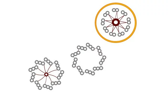 Rechts oben: Sternmuster der Übergangszone zwischen Flagellum und Basalkörper. Der Ring im Zentrum stellt einen Schnitt unterhalb der Mitte des Hohlzylinders dar, der in der Mitte eine durchgehende Platte besitzt. Mitte: Basalkörper mit neun verbundenen Mikrotubulitripletts. Unten links: Unterster Bereich des Basalkörpers mit wagenradartiger Struktur.
