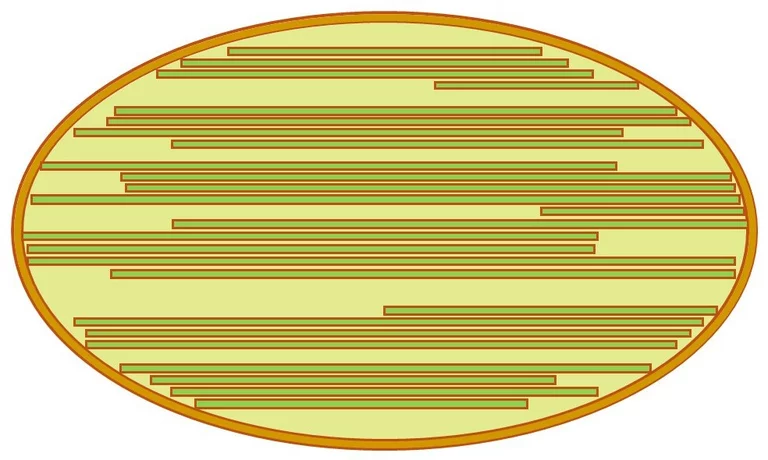 Thylakoide als langgezogene Dreier- bis Viererstapel, z. T. auch höhere (Cisternenraum dunkelgrün mit brauner Umrandung für die Lipiddoppelmembran).