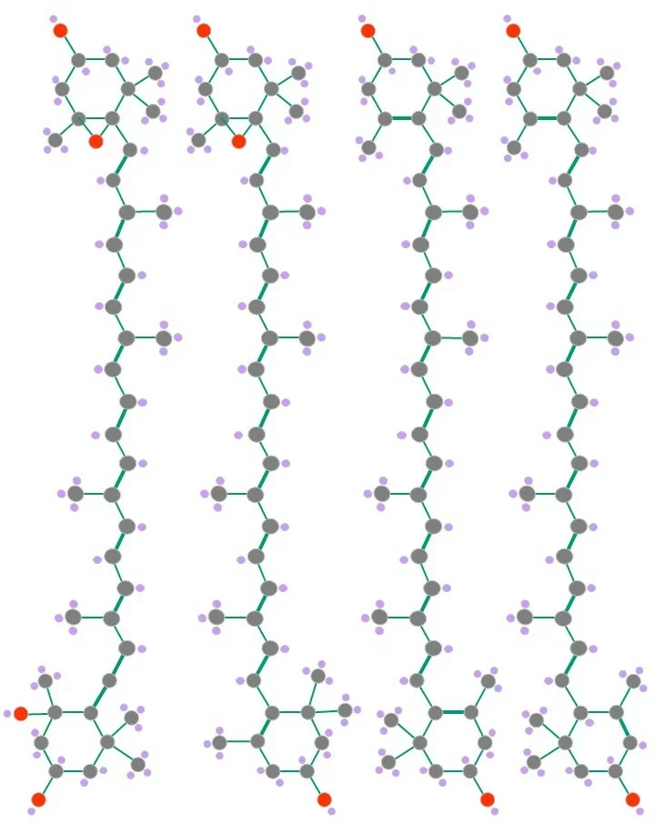 [9] Xanthophylle: Im Gegensatz zu Carotinoiden tragen Xanthophylle sauerstoffhaltige Gruppen in Form von Hydroxyl- [–OH], Carbonyl- [–CO] und Carboxyl-[–COOH]