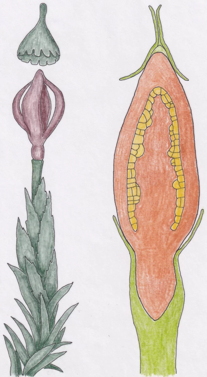 Erst bei Reife aus dem umgebenden Blattschopf auf einem Pseudopodium[14] heraus.