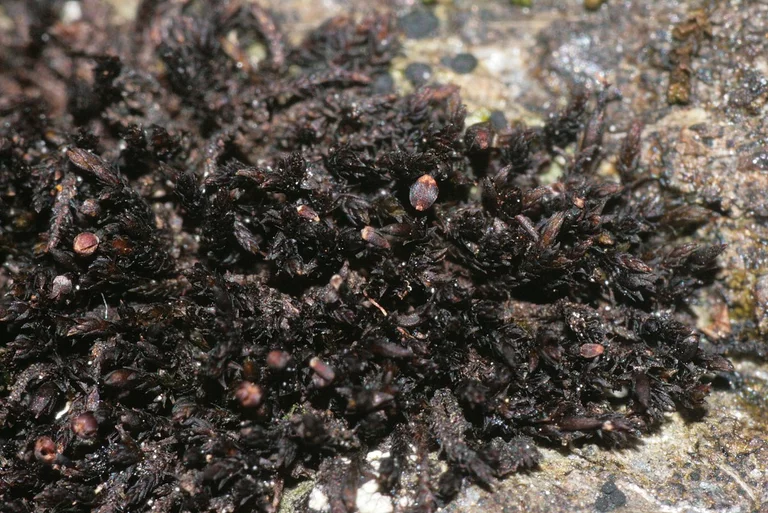 Fast schwarzes Polster durch Pigmenteinlagerung; einzelne Mooskapseln (schlitzförmig geöffnetes Miitte links) zu sehen