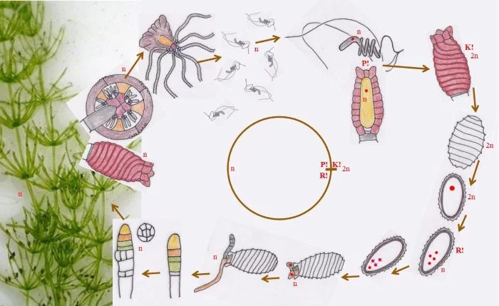 Entwicklungszyklus von Chara (Tusche-, kreide-, bleistift- und ppt-generiert; Reinhard Agerer)