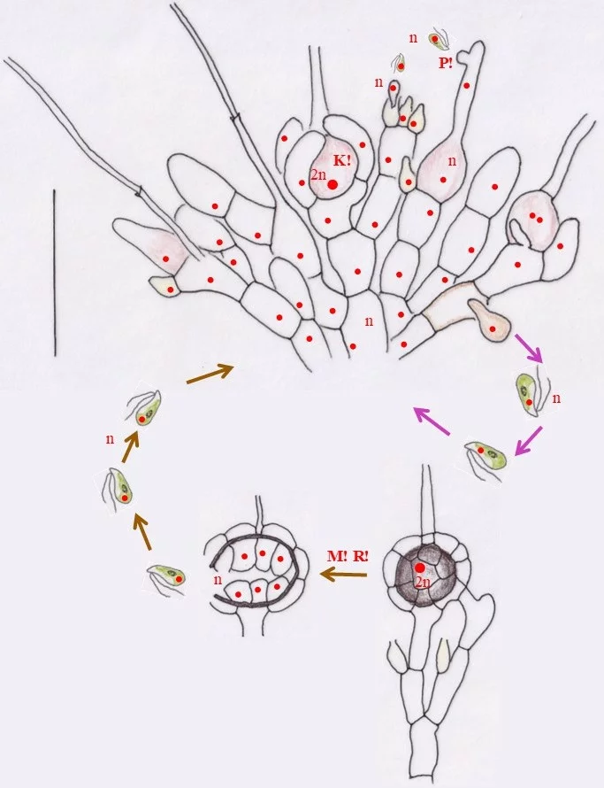 Oben: Ausschnitt aus einem pustelförmigen Thallus. Verzweigte, trichal organisierte, haploide (n; kleine Punkt-Kerne) Trichome tragen an einigen Enden Oogonien (rosa eingefärbt; Falschfarbe) in unterschiedlichen Entwicklungsstadien; von links nach rechts: etwas Richtung Apex verjüngte, einkernige Zelle (junges Oogon-Stadium) – Oogon mit bereits vollzogener Karyogamie (K!) und diploidem (2n), großem Kern; Zygote von der geöffneten Trichogyne durch Zellwand abgetrennt – Oogon in dessen Trichogyne nach Plasmogamie (P!) mit einem Spermatozoid der männliche Zellkern zum weiblichen Kern wandert – Oogon, abgetrennt von der leeren Trichogyne, mit beiden Zellkernen kurz bevor die Karyogamie stattfindet.