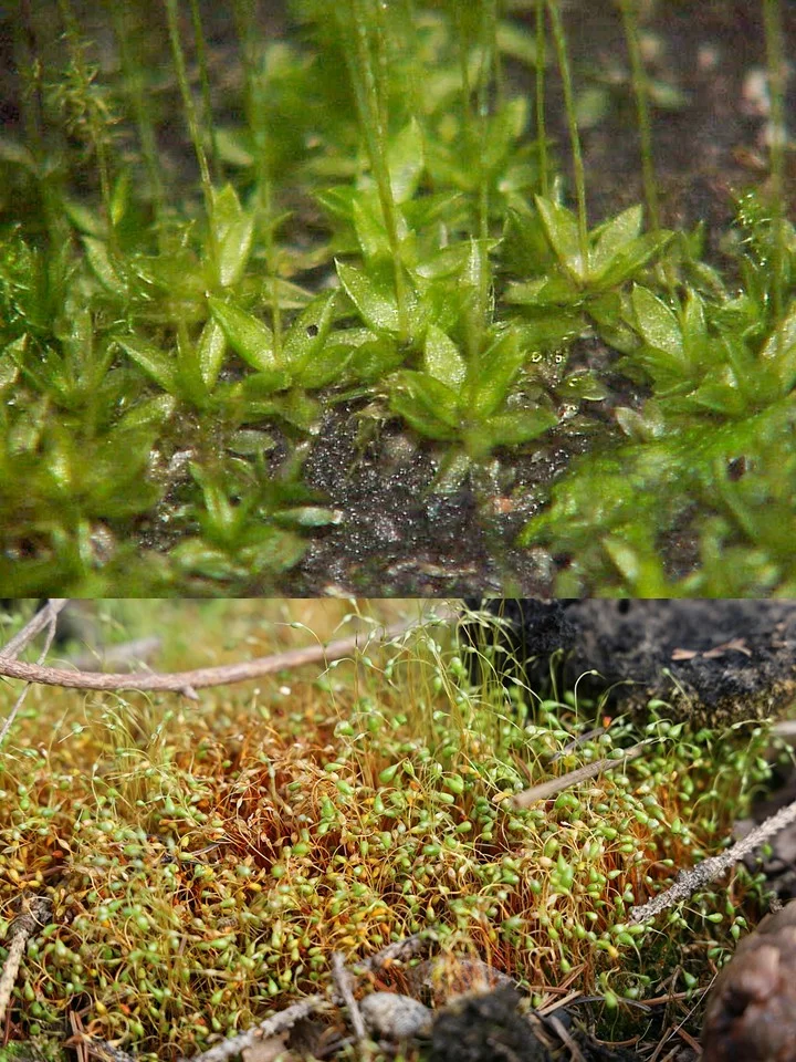 [1] Protonema (Laubmoose): Ein haploides, trichales Verzweigungssystem nach der Sporenkeimung, an dem später das typische haploide Moospflänzchen entsteht.