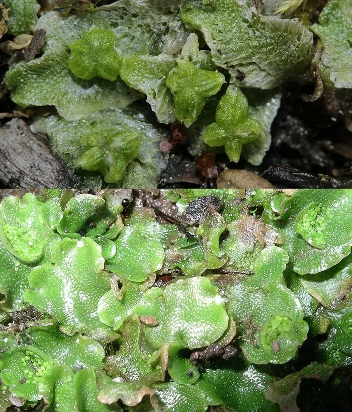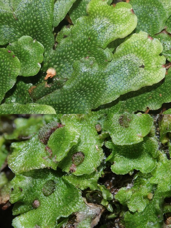 Oben: Conocephalum conicum, Kegelkopfmoos