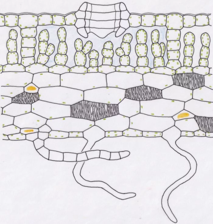 [6] Cuticula (Plantae): Wachsartiger Überzug, der nur Epidermiszellen von Blättern und jungen Sprossen und anderen der Luft ausgesetzten Geweben ohne Periderm überzieht. Durch ihre hydrophoben Eigenschaften verringern sich die Wasserverluste der Pflanze.