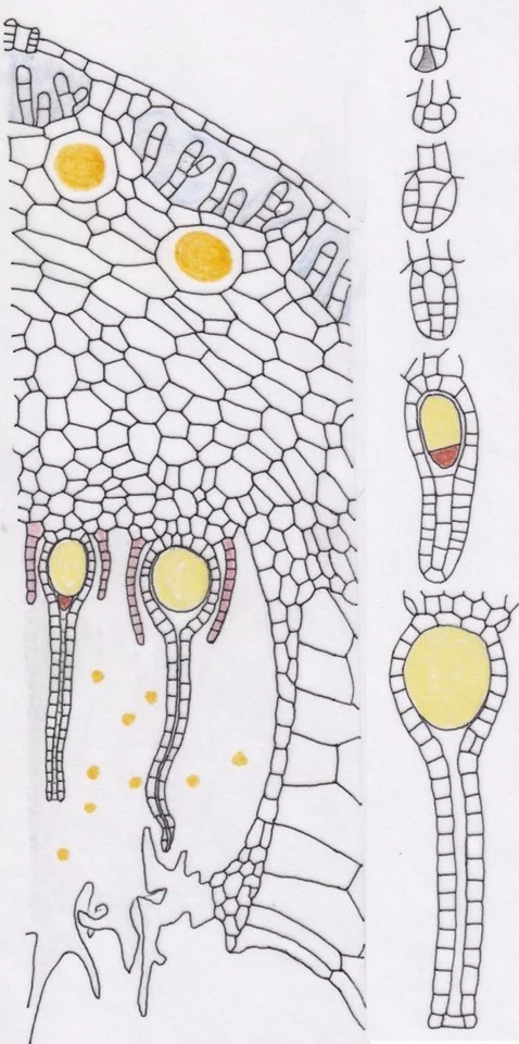 [14] Rhizoide: Fadenartige, wurzelähnliche, trichale oder unseptierte Auswüchse zum Festheften von Thallophyten