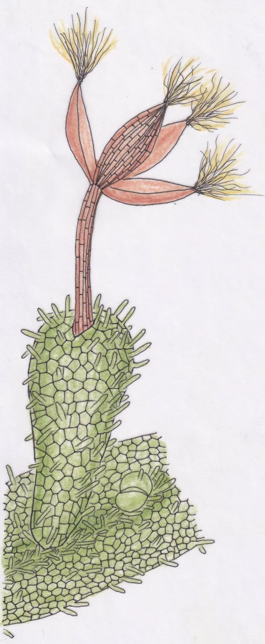 [13] Seta (Moose): Basaler, langgestreckter Teil des Sporophyten, der die Mooskapsel aus dem zunächst noch schützenden Bauch des Archegons und evtl. aus noch zusätzlichen Hüllen in die Umwelt streckt