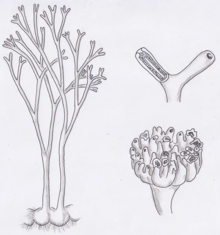 Rechts unten: Vermutlicher Gametophyt von Horneophyton lignieri; distaler Bereich mit Gametangienstand und fingerartigen Fortsätzen mit Archegonien.