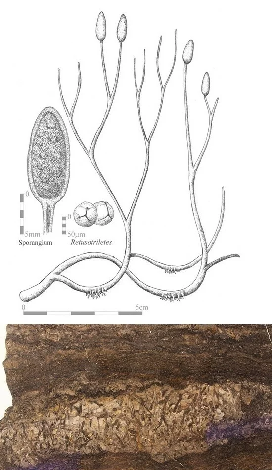 Oben, rechts: Rekonstruktion des fossilen Fundes: Stolonen mit Rhizoiden, Gabelsystem mit Sporangien am terminalen Ende; oben, links: Sporangium; oben, Mitte: Trilete Sporen, die als separate Fossilien einen eigenständigen Namen (Retusotriletes) erhielten, doch offenbar zu Aglaophyton major gehören.