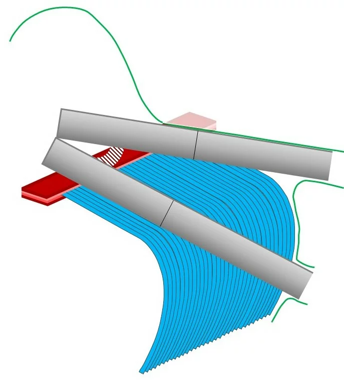 Dreidimensionale Seitenansicht des Zellapex‘: Flagellen mit Basalkörper (grau; Basalkörper abgegrenzt). – Quergestreifte, die Basalkörper zusammenhaltende Struktur (braun und schraffiert). – Breites Mikrotubuli-Band (blau; 32 von etwa 60 Mikrotubuli dargestellt), das der Zelle (grün; Plasmalemma) nach unten entlangläuft. – Vielschichtige Struktur (unterschiedlich bräunlich getönte Ebenen übereinander), von der das Mikrotubuli-Band seinen Ausgang nimmt.